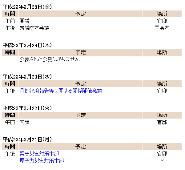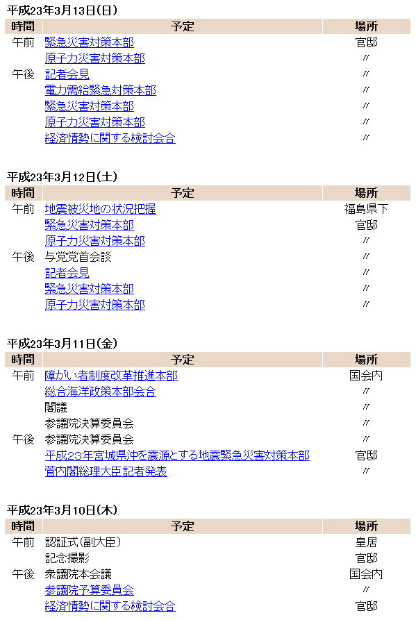 【午前】7時58分、公邸発。59分、官邸着。8時、執務室。41分、班目春樹原子力安全委員会委員長が入った。9時、海江田万里経済産業相、枝野幸男官房長官、福山哲郎官房副長官、寺田学、細野豪志両首相補佐官、武藤栄東京電力副社長が加わった。39分、班目、武藤両氏が出た。10時5分、全員出た。57分から11時24分、斎藤勁民主党国対委員長代理。