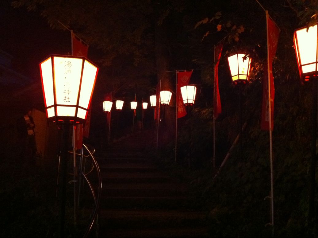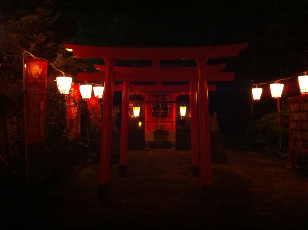 18時くらいになると稲荷神社までの階段にぼんぼりが灯って綺麗でした。当日はこんな感じになるのか?まぁ、人でごったがえすだろうけど(笑)